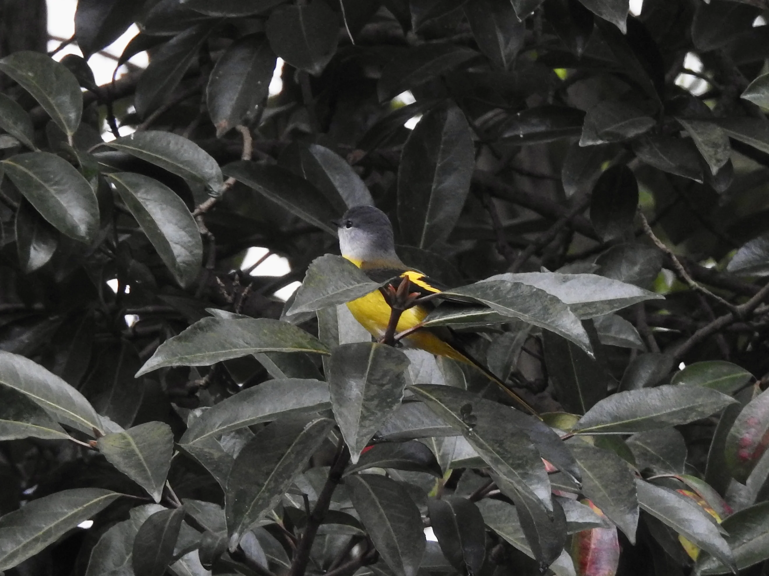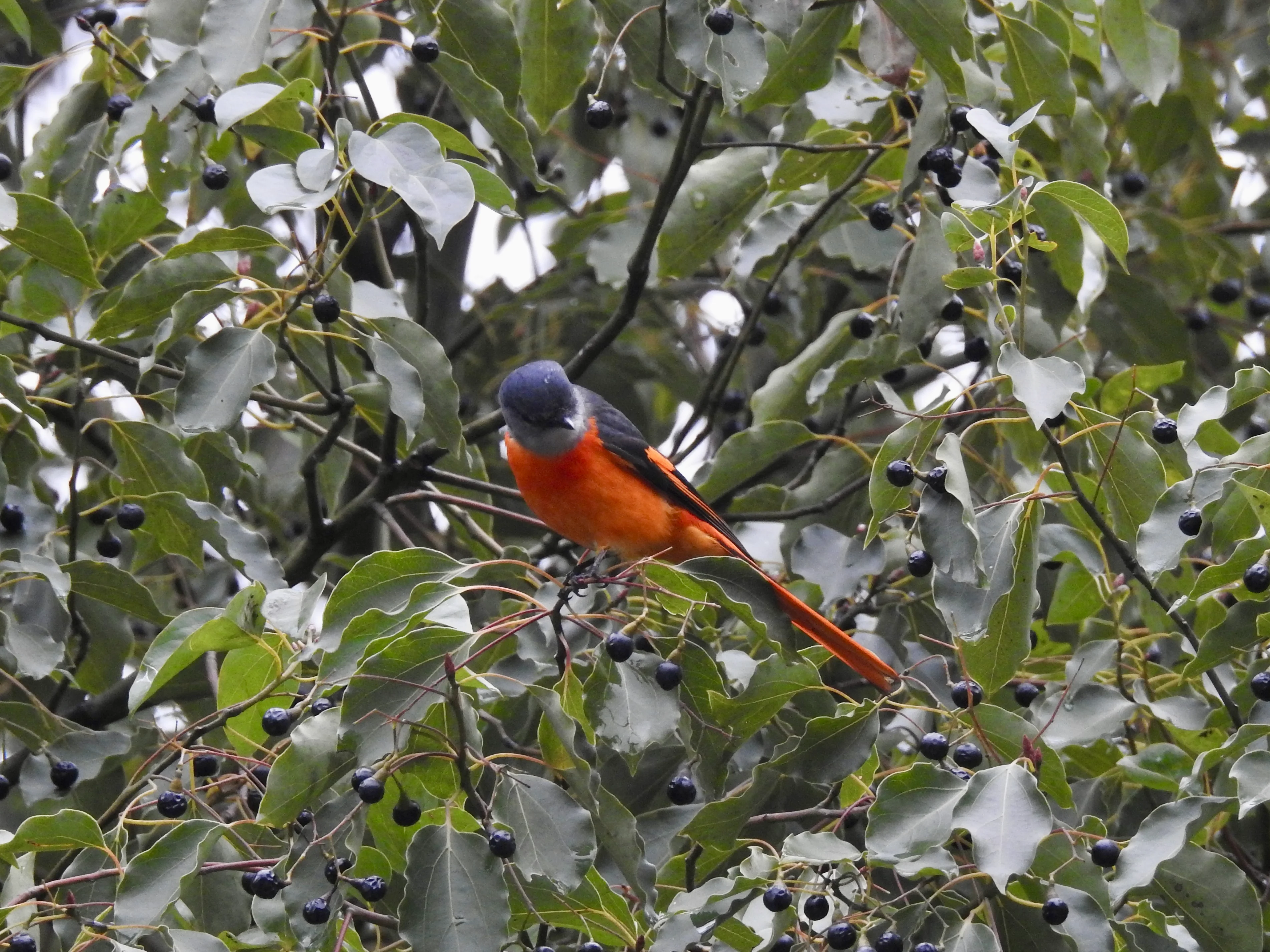 眼看着差不多到午饭时间了,我们便往回走。刚走到山外山门口的停车场,树上突然一阵骚动。树下的保安非常有经验地往树上一指,淡然道:“山椒鸟来了。” 墨灰色的叶子之间顿时有了红和黄的颜色,大概接近20只灰喉山椒鸟集群从我们头上路过。他们的取食方式有点像小鸟群过境,都是落在枝条上检视一下,又转移到下一根枝条,并不走回头路。(和外表有点相悖的是,它们是食虫主义者!)