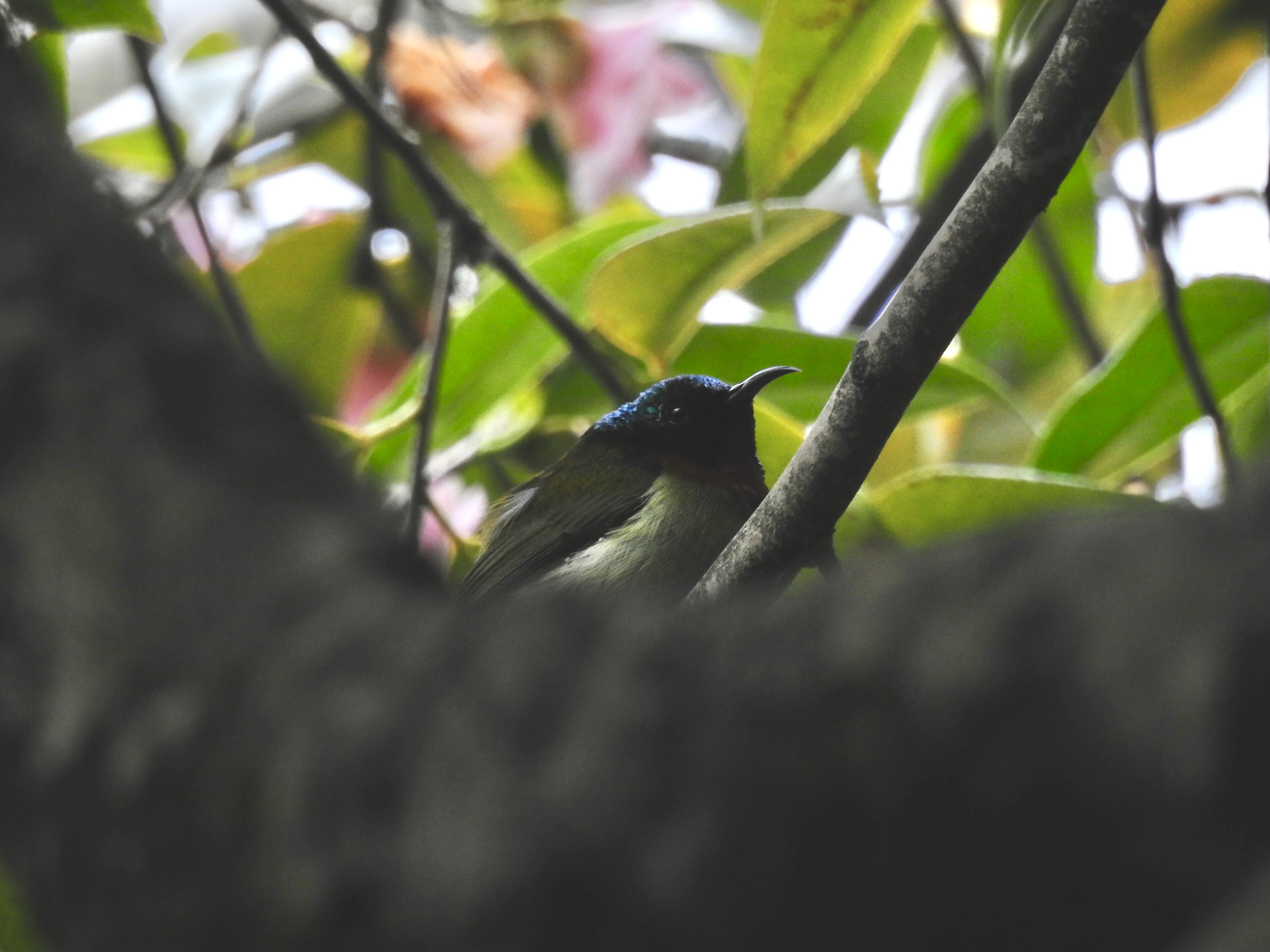 饱餐一顿再次出发,出门就在山外山门口的茶树上遇到了叉尾太阳鸟。要说它怕人,它确实不跳出来;要说它不怕人,它也完全不在意在离我们超级近的茶树上小声唱歌。我们绕着茶树转了好几圈,最后在一个很刁钻的位置才勉强看见了它的头。虽然只能看见很小一点,但它转头的时候羽毛的金属闪烁还是很迷人。有不少路人都看着我们这一大部队在树下转来转去,好奇地问我们在看什么。该说是每次观鸟必经的一环吧……