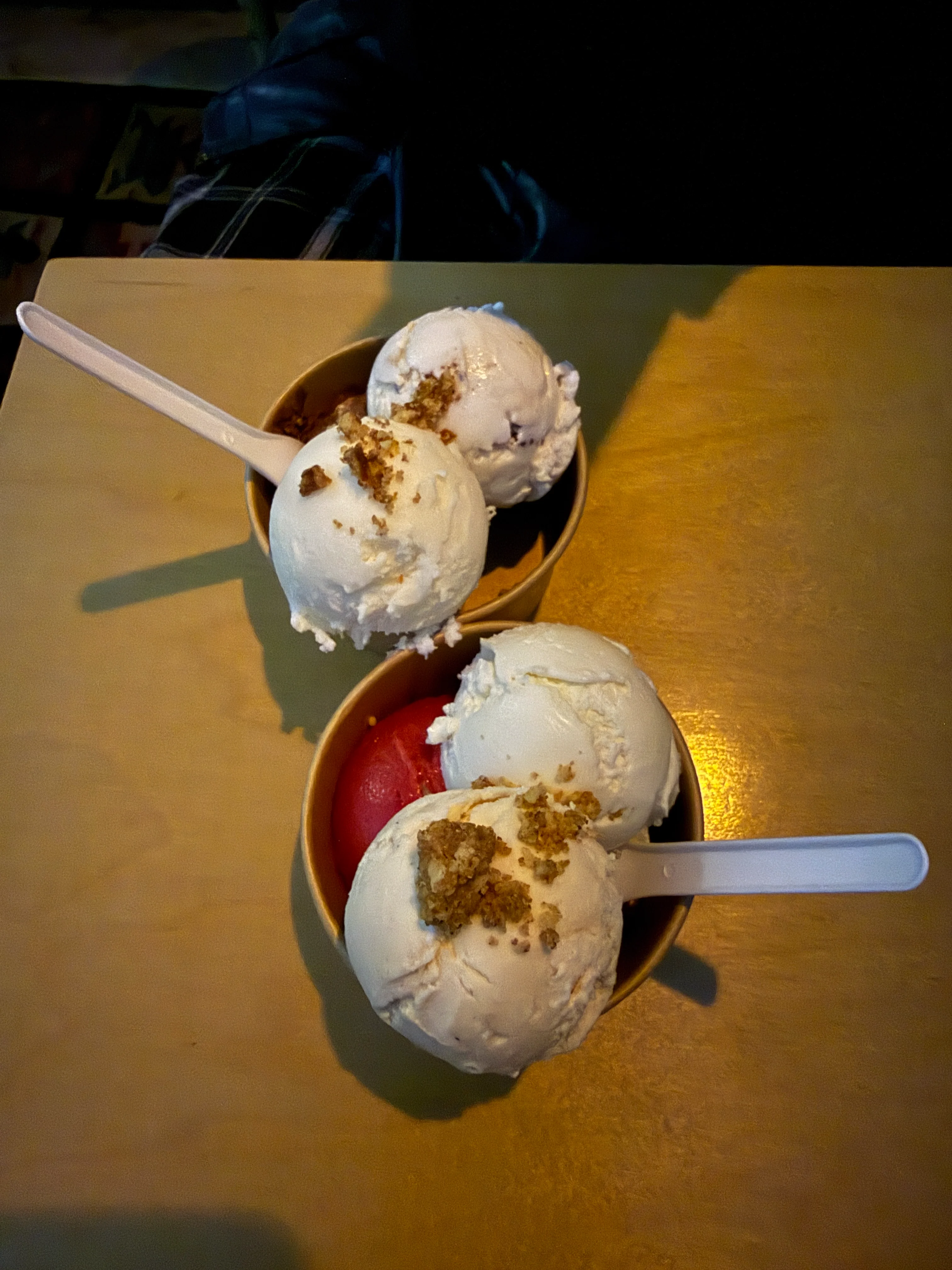 傍晚,队友们回到住处后都纷纷进行一个呼呼大睡,我和莱特在民宿下榻后休息了会便出门觅食。晚饭吃了一家当地的 Gelato 和潮汕虾粥。冰激凌有一个“橄榄油灰盐”口味,真的是吃起来有点灰的味道,但意外地好吃。潮汕虾粥这家店也是非常有意思,在一个 KTV 旁边看起来诡异得不行,一搜评价还有一条很好笑的好评:“有老鼠,特别大,但是菜品和粥真不错!”感觉不像串的哈哈哈哈(粥确实好吃!