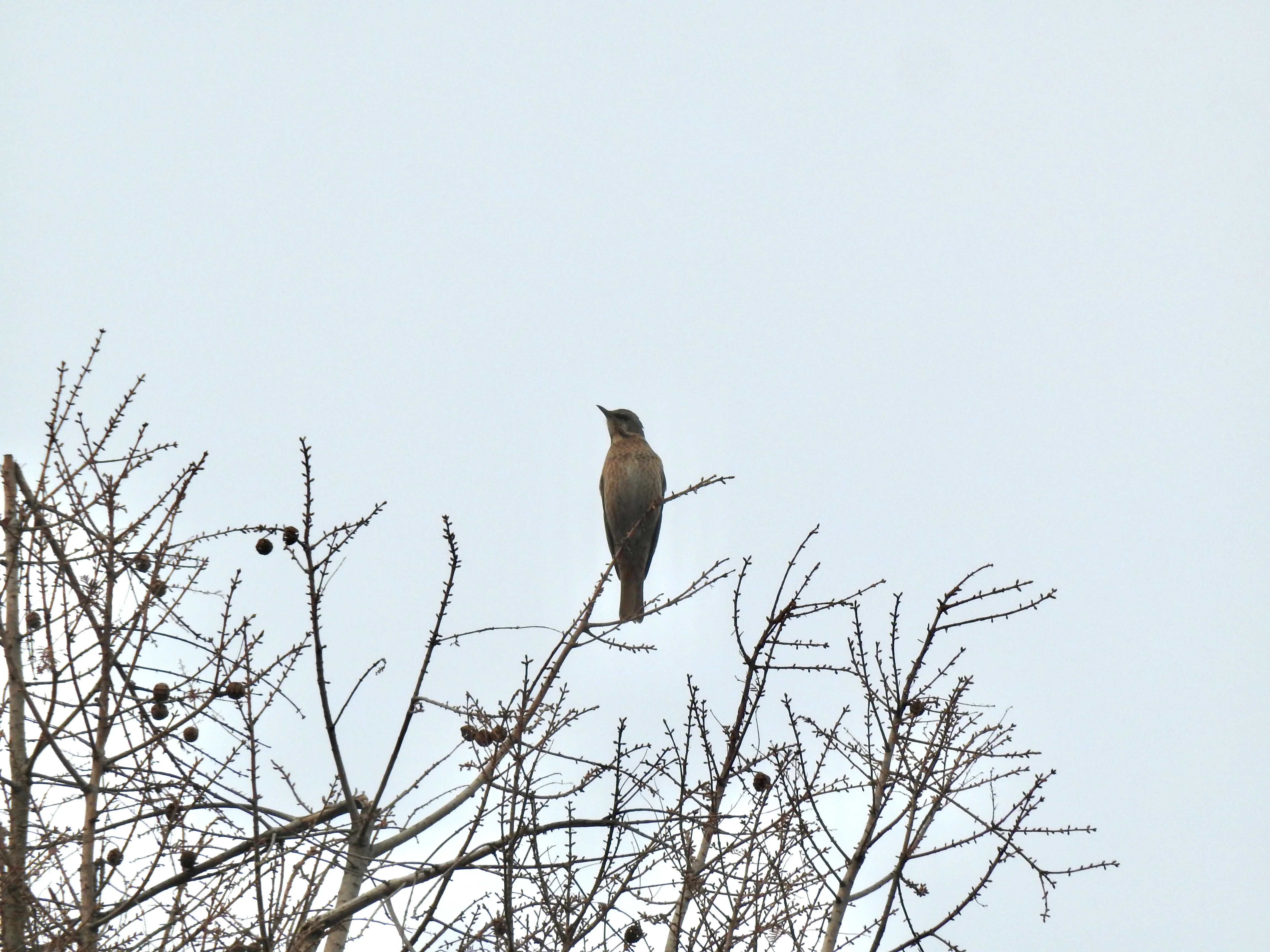 看完了小太平鸟我们就看起附近水杉树上的大拟啄木鸟起来。在树顶还停了一只别的鸟,看了半天它突然露出带斑点的肚皮和略带红色的腹部和和尾部,这下真的是红尾斑鸫了。(在上海几乎都是斑鸫)