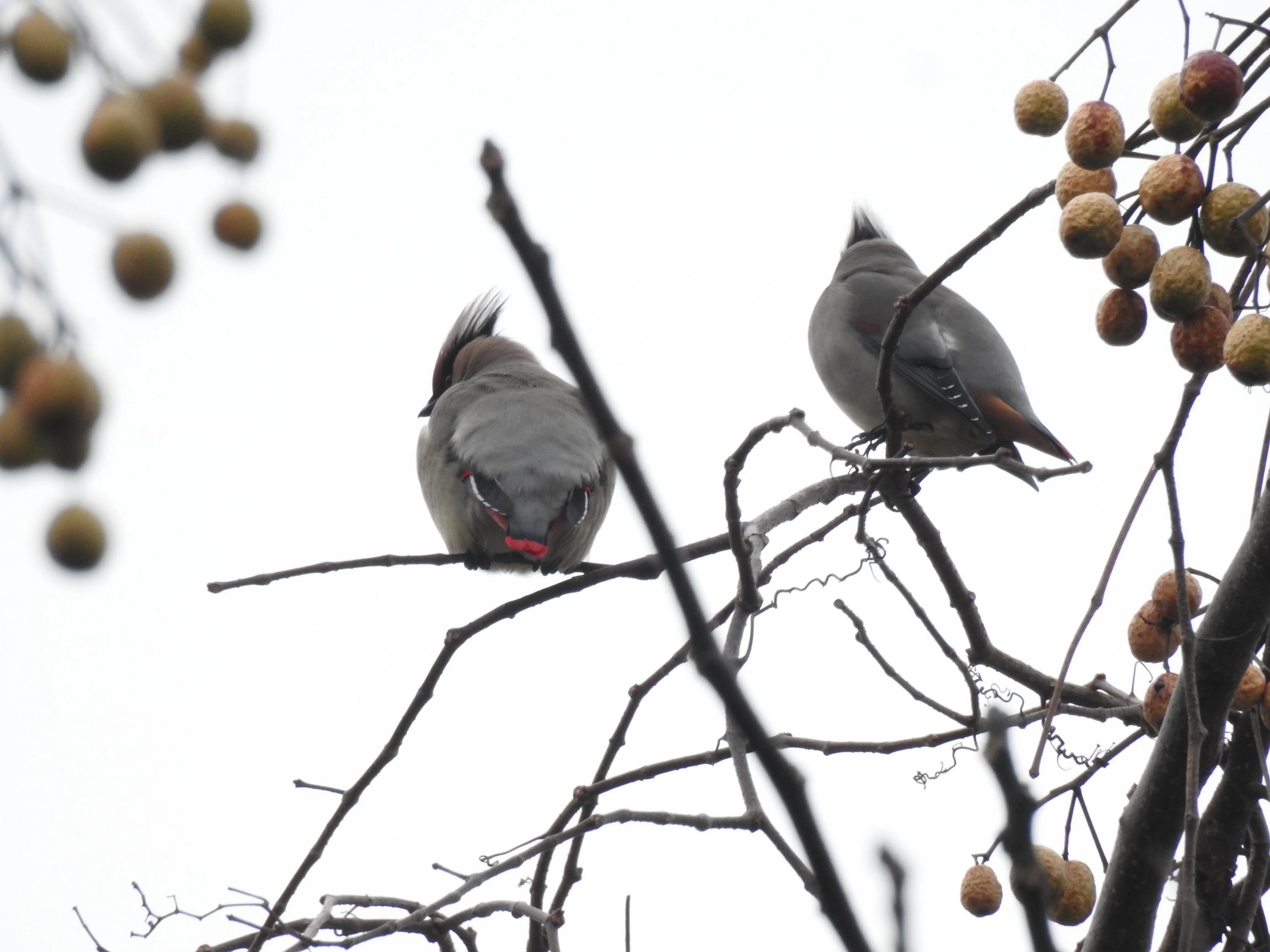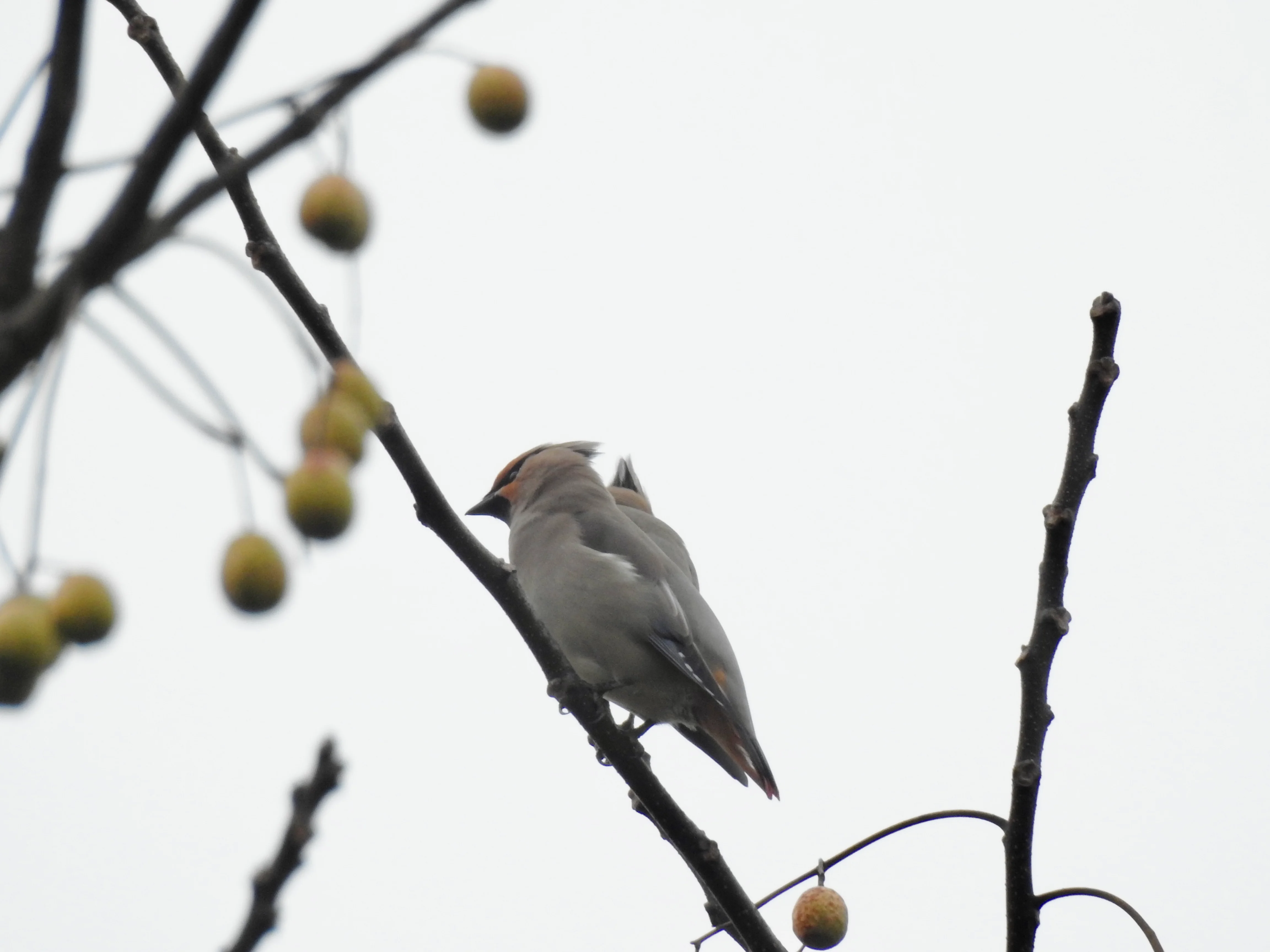 既然有小太平鸟,就有大太平鸟。(?)大太平鸟学名就是太平鸟,和小太平鸟除了体型上有些许差异外,它的尾巴尖也是黄黄的,和小太平鸟的红色尾尖得以区分。太平鸟的英文 “waxwing” 其实是来源于太平鸟次级飞羽端部的蜡样附着,但小太平鸟并没有这个结构。它们也以集群在秋冬季节觅食闻名,是实打实的吃货,甚至还有因为吃到发酵果实、一群鸟醉倒在路面上的记录。可能是因为天冷,小太平鸟停歇时把翅膀收在胸前覆羽的后面,模糊了翅膀的轮廓,看起来很暖和。(揣手手!)