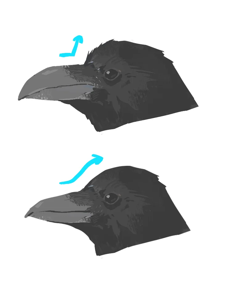 虽说大嘴乌鸦的特征就是大嘴+体型大,但其实在野外观察距离较远+阴天,大概率无法比较喙部的大小,相比之下额头和喙的轮廓反而更能辨识。大嘴乌鸦有一个比较高的额头,而小嘴乌鸦则有相对柔和的曲线。