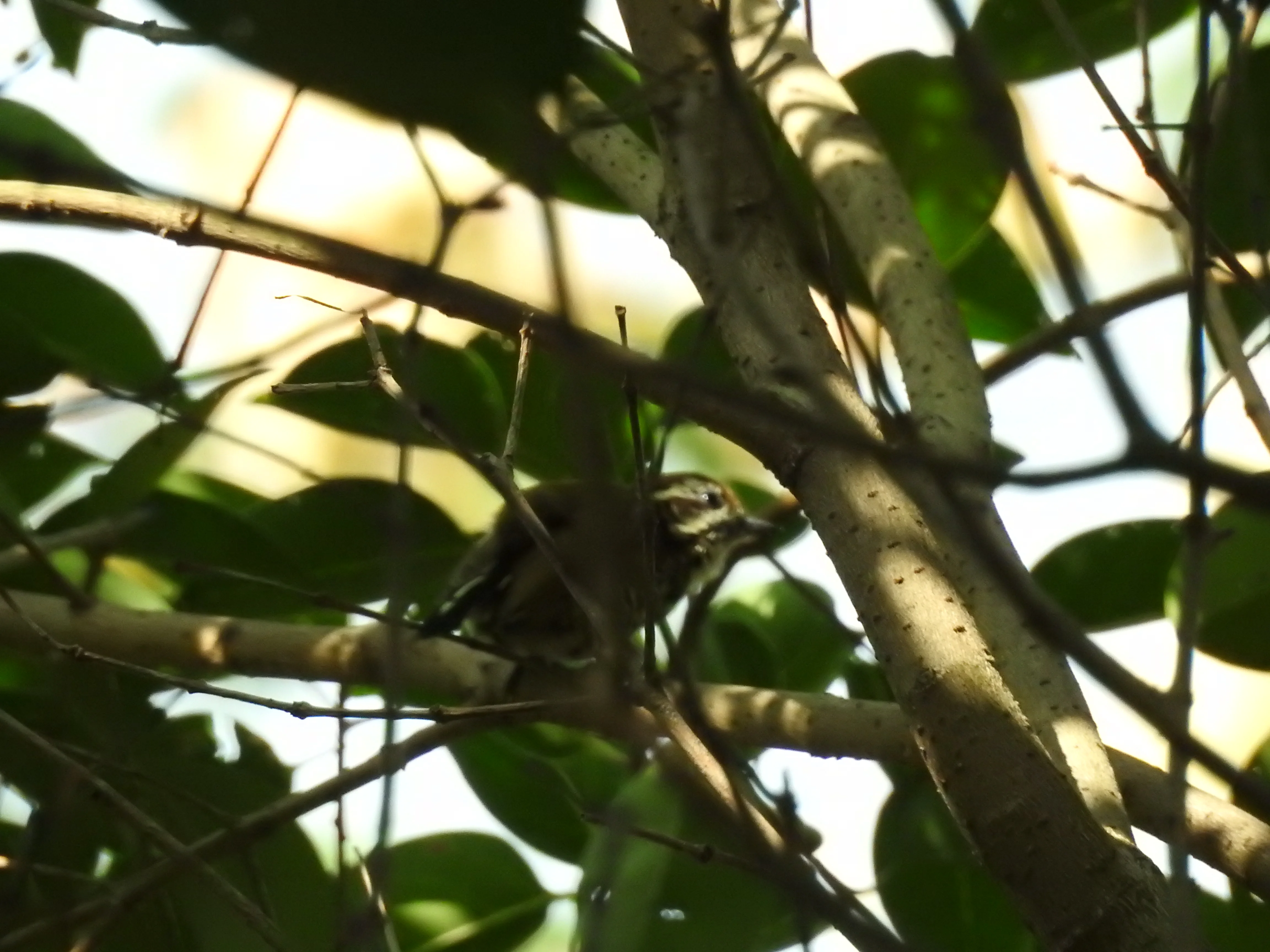 道路的尽头是一片樟树林。我正在驻足观察乌鸫们,突然就听到头顶一片“zuizui”声呼啸而过,是绣眼鸟浪!其他小鸟也跟着一起过来了,有柳莺、白头鹎、大山雀等等。在那之中我还看到了一个褐色的麻雀大小的身影,一开始在想也许是画眉,直到看到腹部的斑点——是斑姬啄木鸟!
