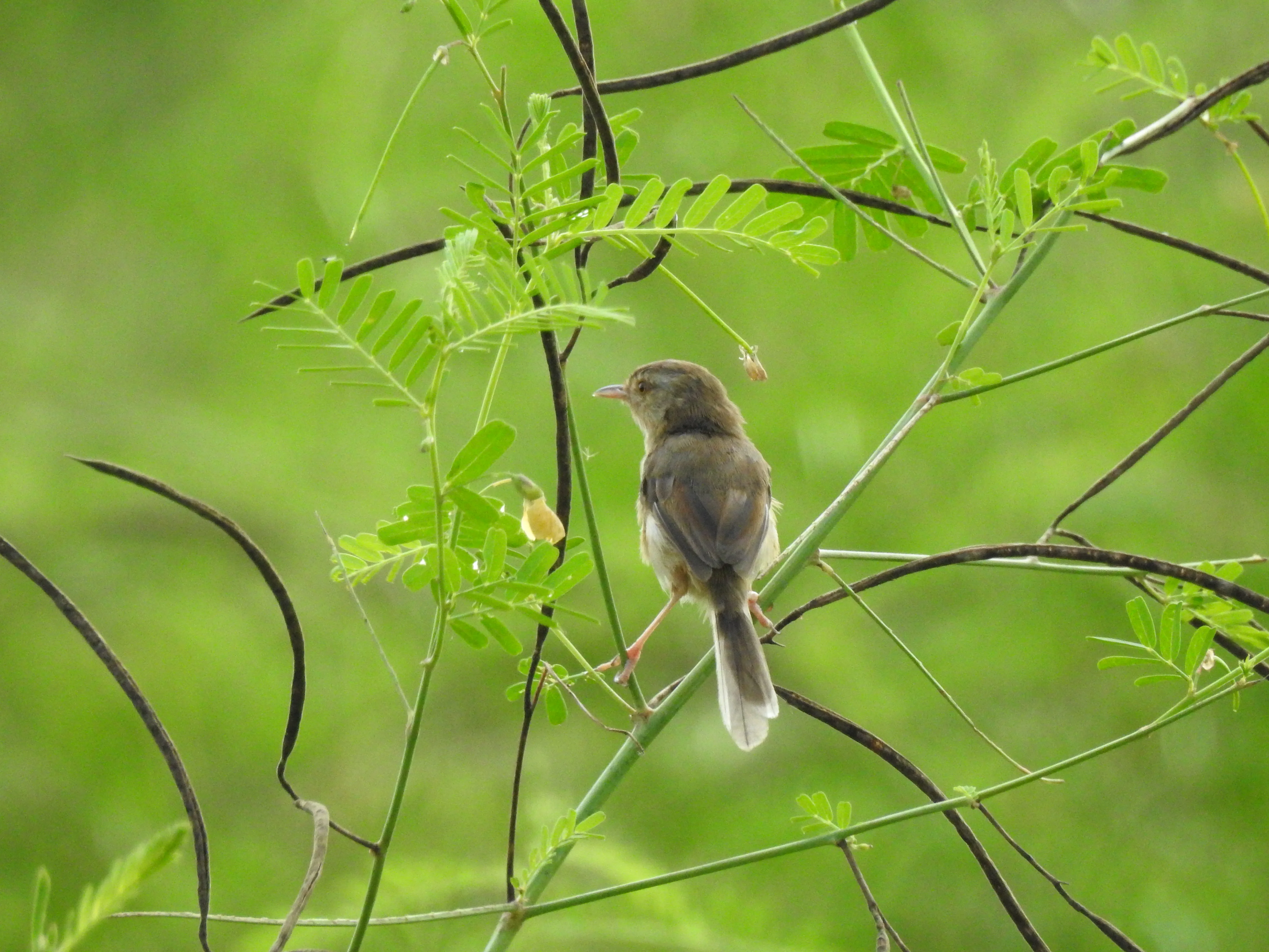 另一种先前听到的鸟鸣,其主人也现出了正身,是纯色山鹪莺。其实纯色山鹪莺在上海不算罕见,只是它们更喜欢有芦苇的区域,而芦苇在市区就不是那么常见了…… 荒地旁边有个小池塘正好满足了这些小家伙的需求。我看到2只在枝条上打成一团,芦苇荡里还有鸣叫声,数量可能有5只以上。